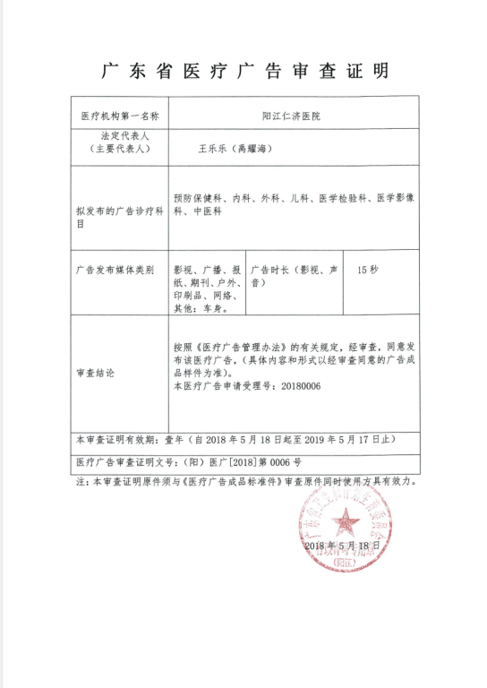 医疗广告审查证明(阳江仁济医院)