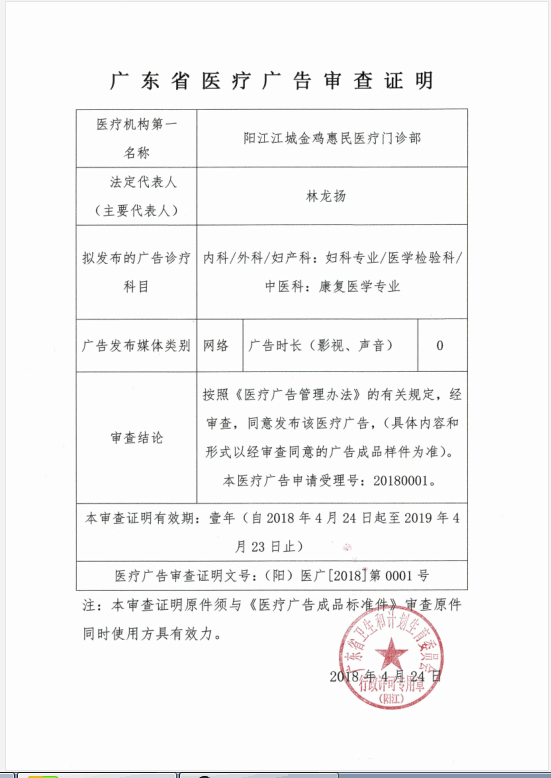 金鸡惠民医疗门诊部医疗广告审查证明